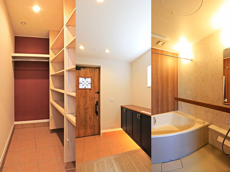 左から、シューズクローゼット・玄関・バスルーム。どこも灯りがあたたかさを演出しています。