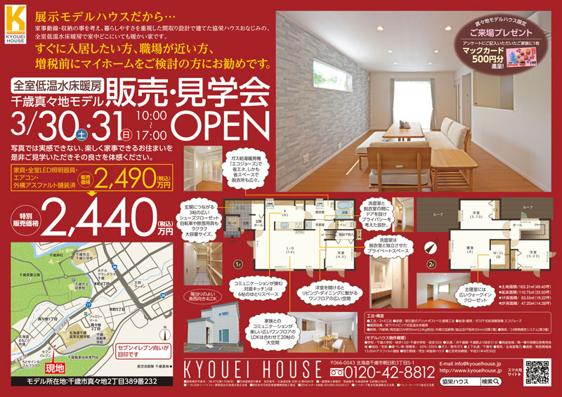 真々地モデル price down! 千歳・恵庭・札幌|モデルハウス・新築・戸建て・土地【協栄ハウス】 > 全件 > イベント > 真々地モデル price down! 今週ちゃんとの折り込みになっている真っ赤なチラシ…もうご覧になりましたでしょうか? そうなんです、タイトルの通りなんです!真々地モデルが値下げになりました! ¥2490 →¥2440 50万あったら何できる!?海外旅行行けちゃう!家具も買い替え出来ちゃう!! 住み始めるなら今がチャンスです(‘◇’)ゞ 今回はご来場者様にマックカードのプレゼントがあります♪ご家族揃ってお越しくださいね(^^)/ « 前のページ 一覧に戻る 次のページ » アーカイブ 年を選択 2025 (11) 2024 (81) 2023 (87) 2022 (119) 2021 (165) 2020 (154) 2019 (166) 2018 (246) 2017 (206) 2016 (47) 2015 (23) 2014 (5) カテゴリー カテゴリを選択 全件 お知らせ イベント その他