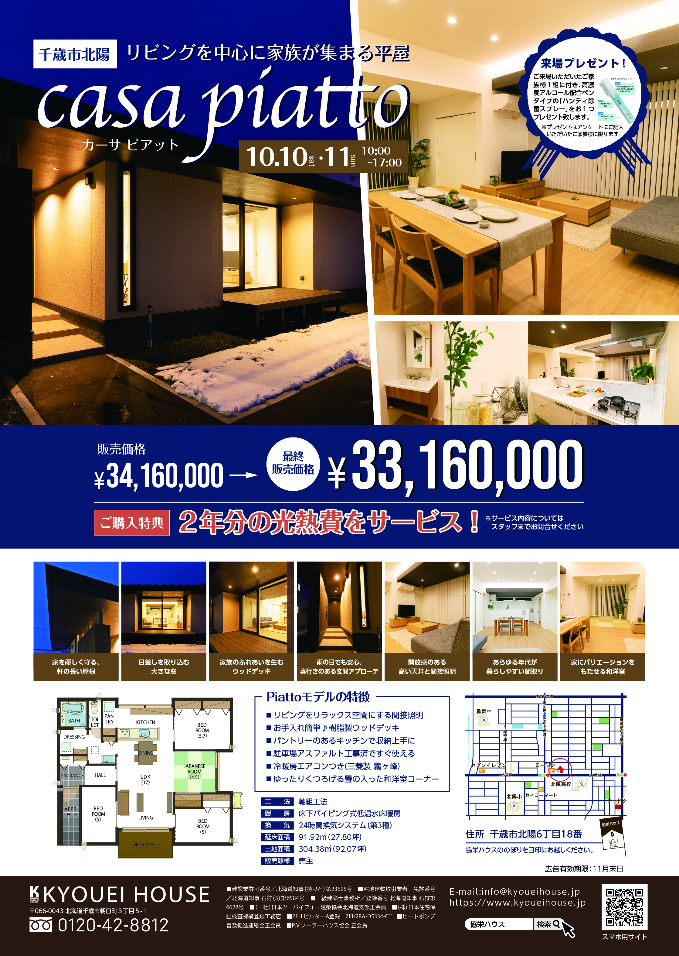 OPENから約1年、沢山の平屋好きの方々に来ていただいたcasa piatto千歳ですが、そろそろ寒くなってきたので、この度価格改訂を行いました。今年の冬からはぜひ暖かい床暖の家で過ごしてほしい。協栄ハウスからのご提案です(^^)