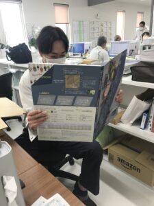 工事部長谷川が見ているのはフローリングのサンプルブックです。