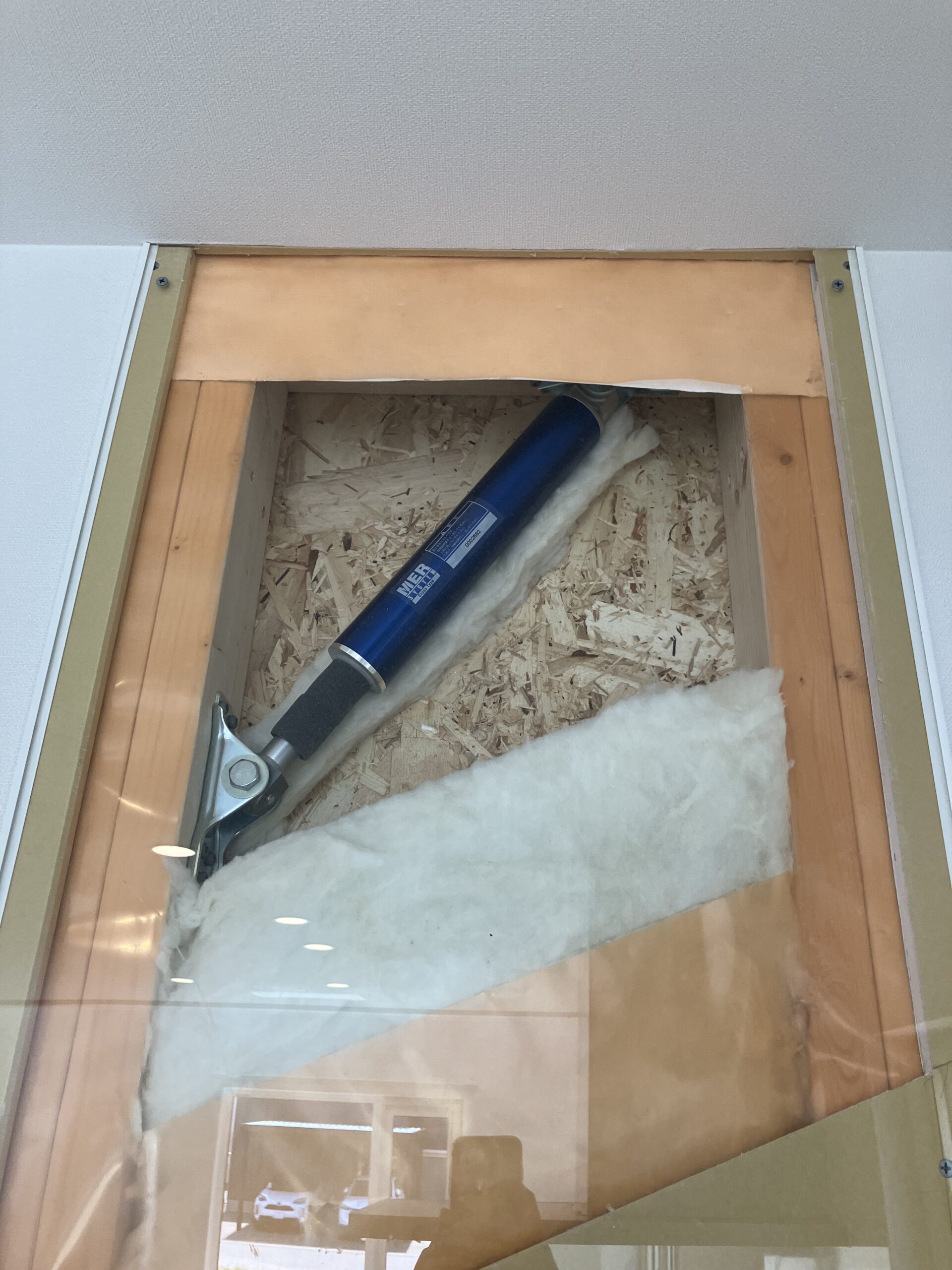 このような制震ダンパーを標準搭載しております。(写真はモデルハウスで見れ、見やすくするためわざとこのような仕上げにしており、お引渡時には綺麗にお直しを行います。)