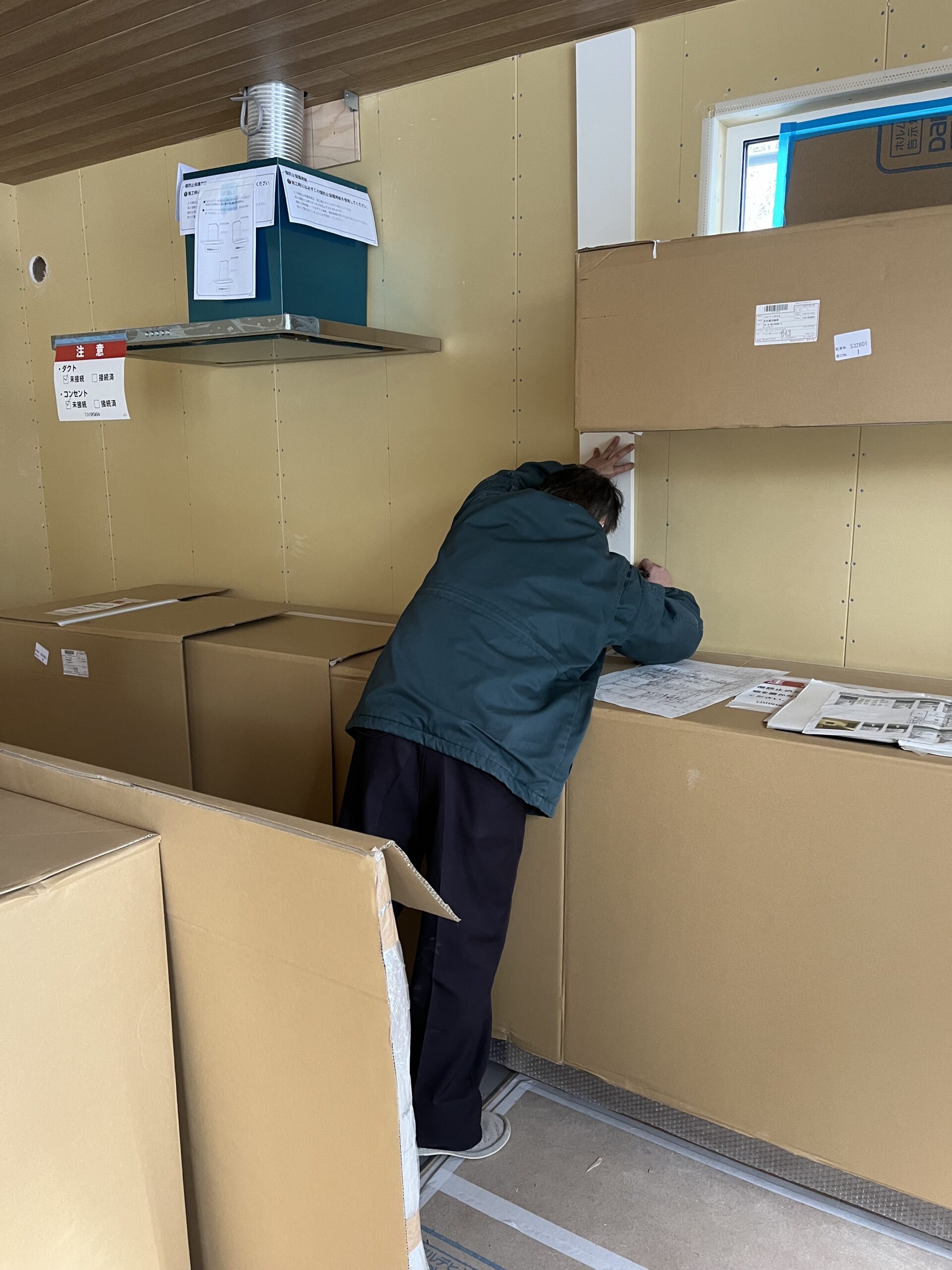 キッチン前のタイルの割り付けとコンセントの位置を確認。