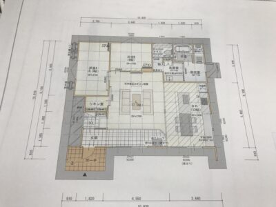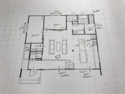 「平屋」で2階が無い分、構造的な制約が思っていたより少なく N様の希望を盛り込み→私からの提案→各担当者に相談を何度か繰り返してできた たたき台の間取りが下の画像です。