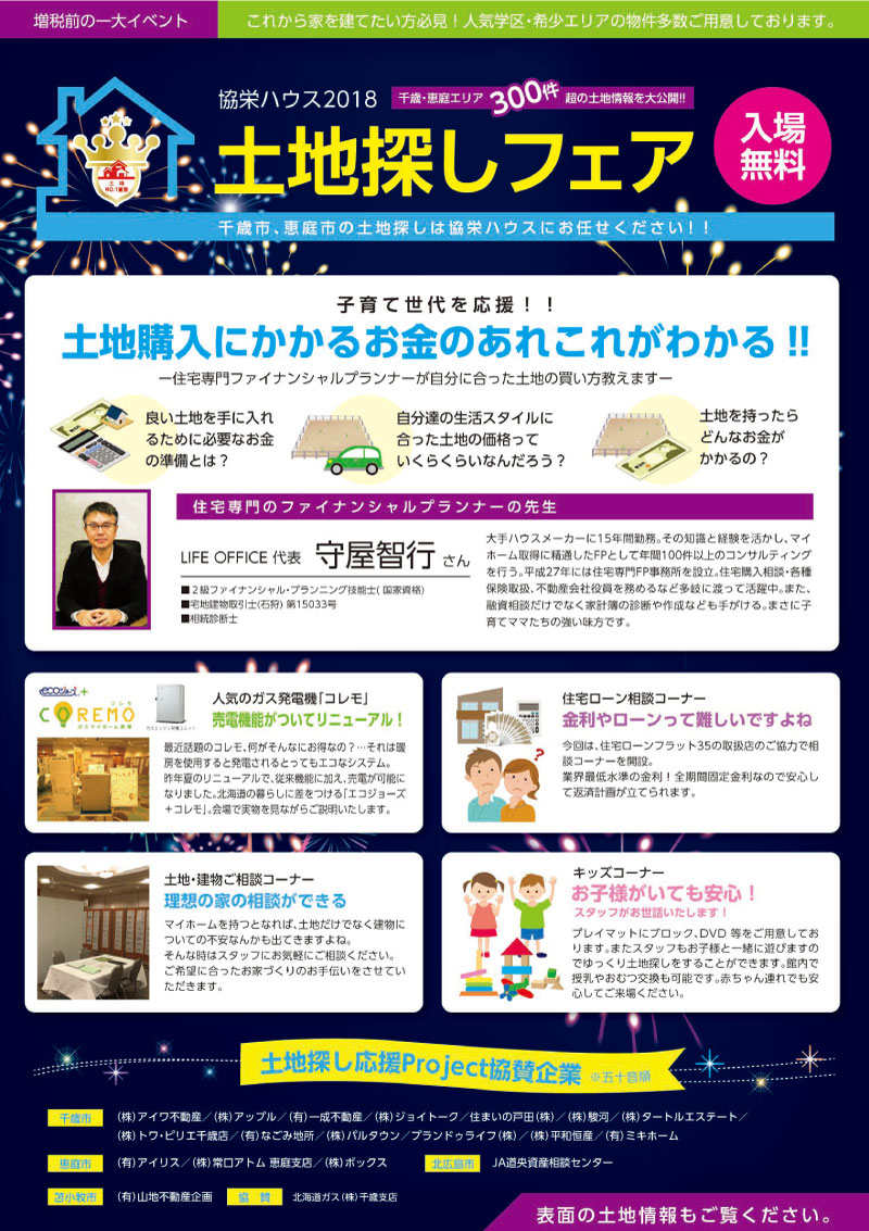 土地がある人でも実はそこ、建てられない土地かもしれません。私の実体験ですが、親から土地をもらおうとしたら、建築法により“建築不可な土地”だということが判明しました。土地探しフェアの利用法は、土地情報を探しに行くだけではないんです。マイホーム取得までの間に発生する不安を解消するいいチャンスでもあるんですよ(*‘∀‘)土地をお持ちの方なら、営業スタッフに見てもらって、建築可能か判断してもらうだけでも家づくりの第一歩ですよね。あとはお金の心配なども出てくると思いますが、そこはFPや銀行の担当さんもお招きしてますので、直接聞いてみましょう!